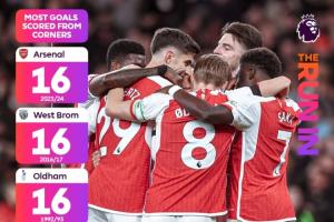 枪手目前距离英超单赛季角球进球最高纪录只差2球,该纪录现为16球,由1992-93赛季的奥德汉姆、2016-17赛季的西布朗以及2023-24赛季的阿森纳共同保持。