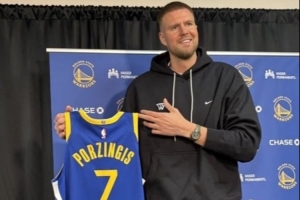 波尔津吉斯手持勇士7号球衣正式亮相。