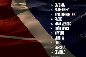 39-萨福诺夫、33-扎伊尔·埃梅里、5-马尔基尼奥斯、51-帕乔、25-努诺·门德斯、87-若昂·内维斯、24-马尤卢、17-维蒂尼亚、14-杜埃、29-巴尔科拉、10-登贝莱
