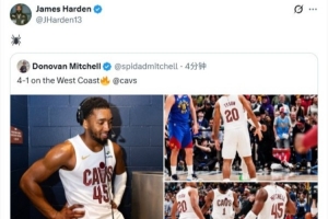 赛后,米切尔发推写道:“西部客场之旅4胜1负。”哈登转发了这条动态,并配上了一个🕷️的表情。