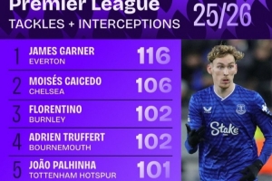 体育资讯2月10日讯 squawka统计了本赛季英超球员的抢断+拦截情况,詹姆斯·加纳力压凯塞多居首。